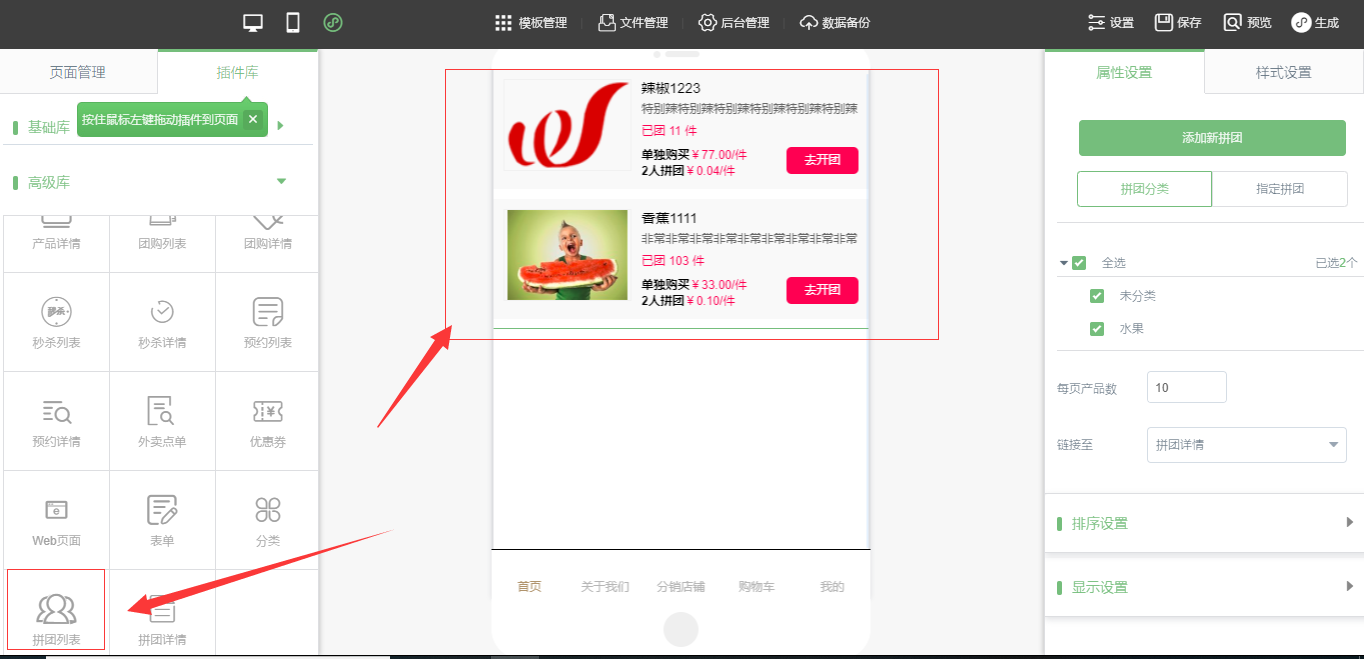 2.在小程序编辑器中,拖入“拼团列表”以及“拼团详情”,在“属性设置”与“样式设置”中设置好页面所需的样式,点击保存即可,如图所示: