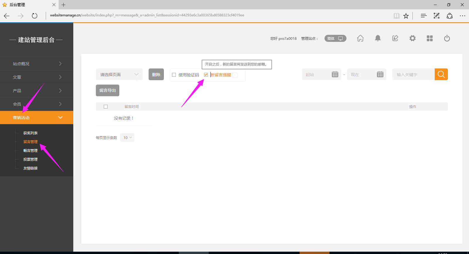 在网站后台营销活动->留言管理->勾选新留言提醒: