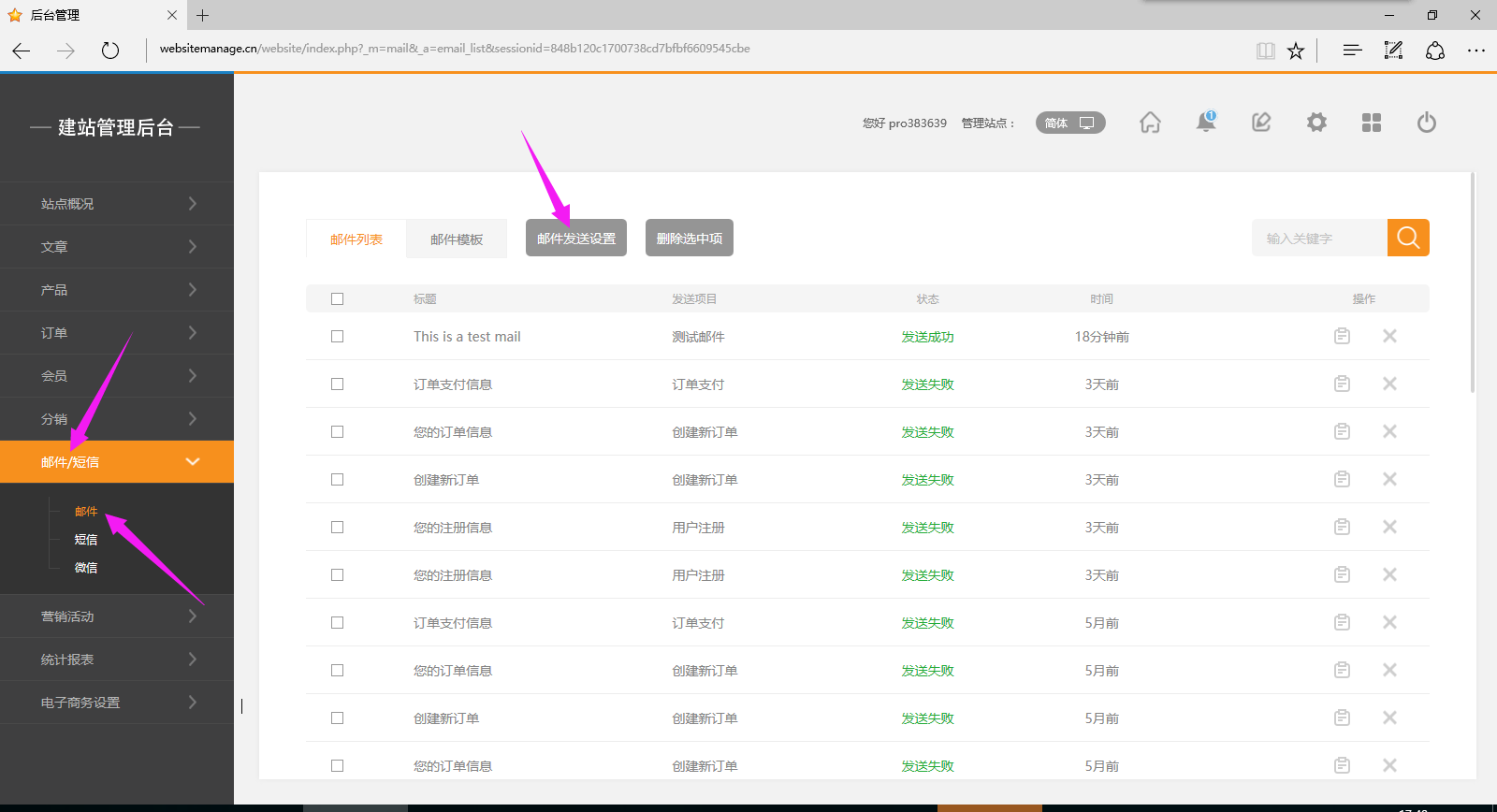 商店后台,依次点击邮件-》邮件发送设置 。