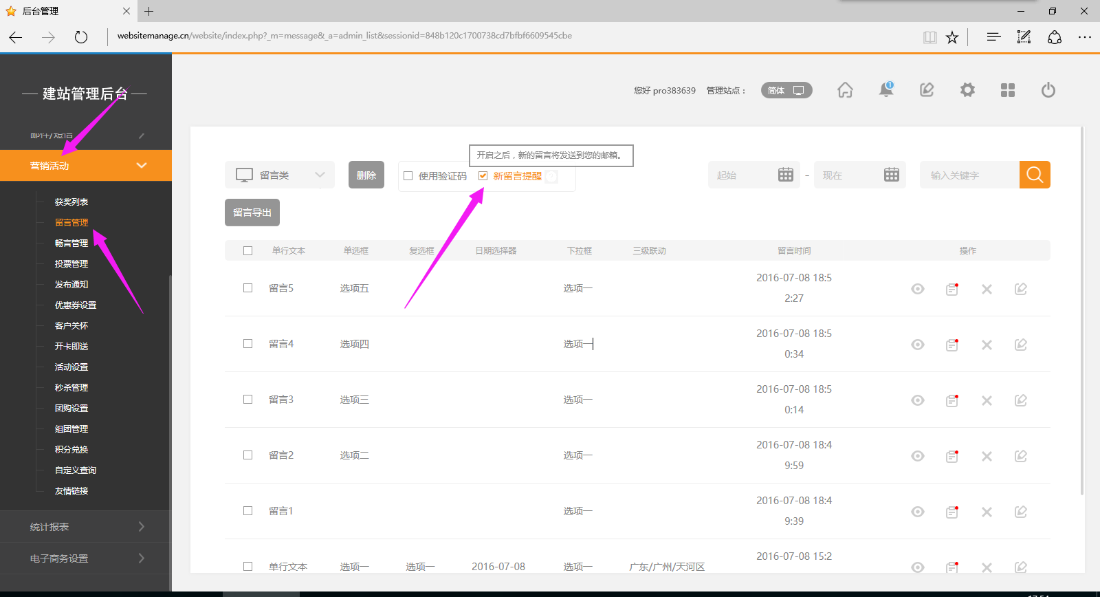 4.营销活动->留言管理->勾选新留言提醒: