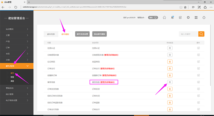 3.邮件/短信->邮件->邮件模板->留言信息,自动发送,更改为:“是”